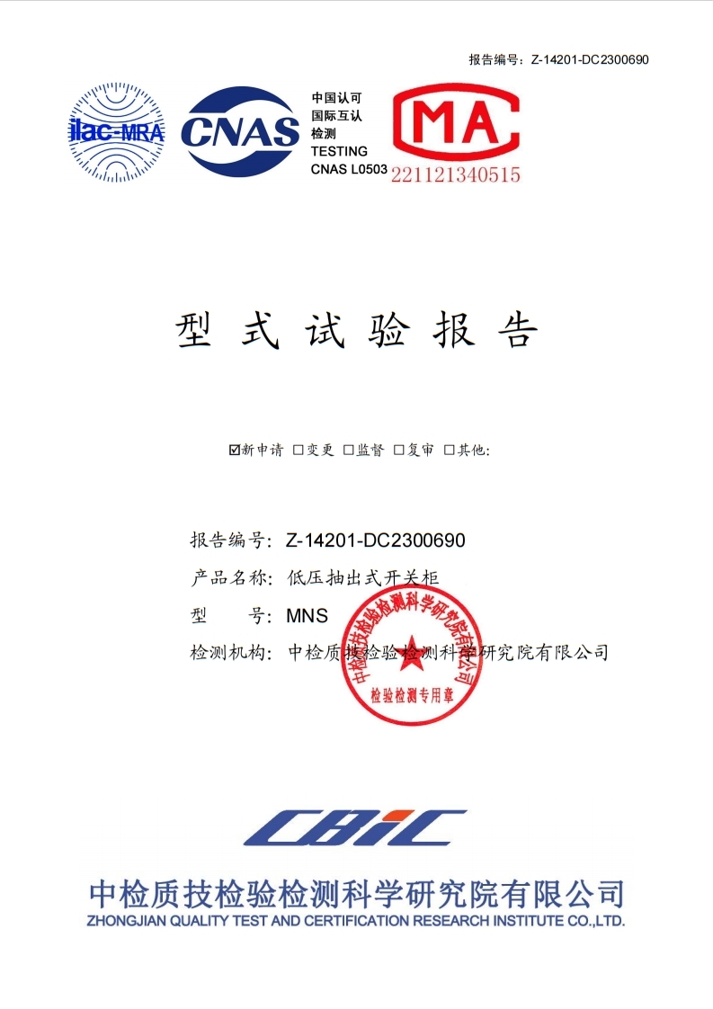 MNS低壓抽出式開關柜試驗報告